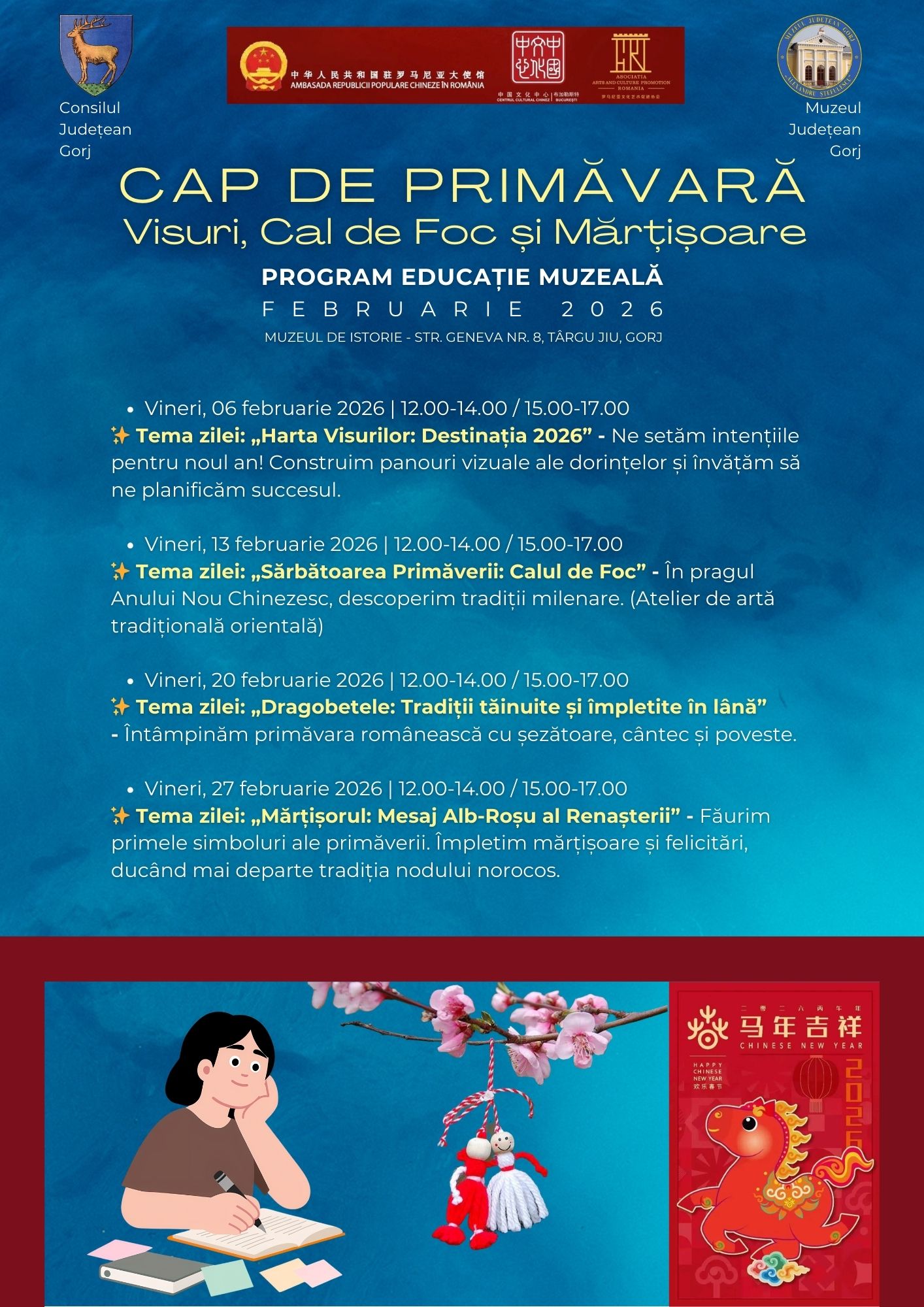 • Vineri, 13 februarie 2026 Tema zilei: „Sărbătoarea Primăverii: Calul de Foc” În pragul Anului Nou Chinezesc, descoperim tradiții milenare. (Atelier de artă tradițională orientală) (Eveniment realizat în parteneriat cu: Ambasada Republicii Populare Chineze în România, Centrul Cultural Chinez la București și Asociația Arts and Culture Promotion Romania)