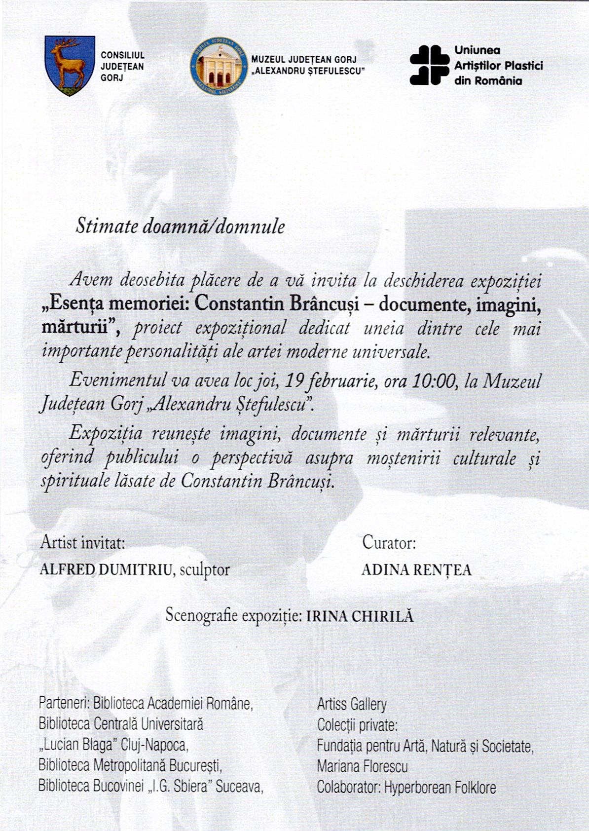 Publicul este invitat la vernisajul expoziției „Esența memoriei: Constantin Brâncuși – documente, imagini, mărturii”, care va avea loc în data de 19 februarie 2026, ora 10:00.